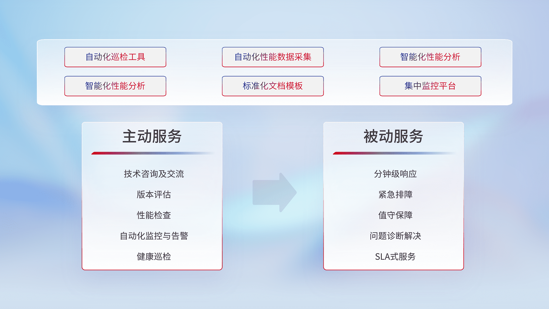 智能化工具和标准化文档,,,,保障服务质量,,提供主动服务(包含技术咨询、、版本评估、、性能检查、、、、自动化监控与告警、、、、健康巡检)和被动服务包含(分钟级响应、、、、紧急排障、、、值守保障、、问题诊断解决、、、SLA服务)。。。。