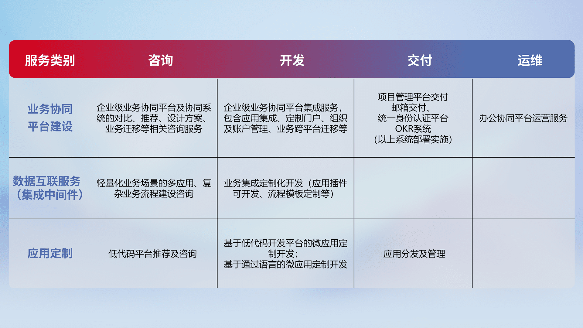 针对钉钉、、企微、、、、IDaas等平台级产品提供产品的规划、、、、方案、、、交付、、定制化开发等服务,,实现如统一协同办公、、、、智能客户服务、、混合会议管理、、智能数据查询、、、、等业务场景,,,,实现数字化转型。。。